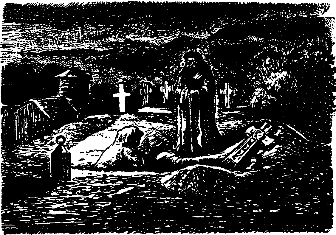 Тихо поскрипывала от несильного ветра кладбищенская калитка. В глубине ночного кладбища у свежей, недавно появившейся могилы, освещаемые светом свечей и полной луны, виднелись две фигуры и небольшая повозка с запряженной в нее лошадью. Оба человека были одеты в темные плащи, скрывающие лица. Один человек ловко орудовал лопатой, раскапывая могилу. Другой стоял в двух шагах от нее и быстро–быстро читал молитвы, слегка склонив голову. Он читал их проникновенно, четко выговаривая каждое слово. Одна молитва сменялась другой.