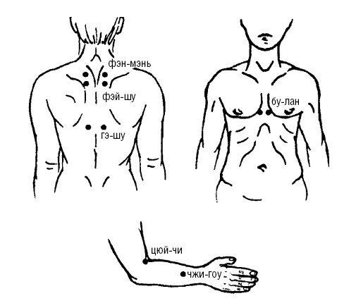 Замечено, что при межреберной невралгии боль при выдохе становится более легкой, в то же время при вдохе боль значительно усиливается, как и при кашле, смехе, чихании. Желательно в комплексе с манипуляциями точечного массажа применять растирающие мази согревающего действия (такие как финалгон, дольпик, алжипан, никофлекс, никодан, випратокс, капсолин и др.). Методика точечного массажа седативная, успокаивающая, расслабляющая (рис. 80):