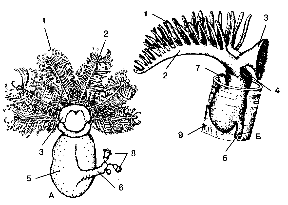 Полухордовые класса крыложаберных: А – цефалодискус; Б – раблоплеура (одна особь колонии); 1 – выросты щупалец; 2 – щупальце («рука»); 3 головной щиток; 4 – рот; 5 – туловище; 6 стебелёк; 7 анальное отверстие; 8 – почки на стебельке; 9 – трубка, окружающая все особи в колонии