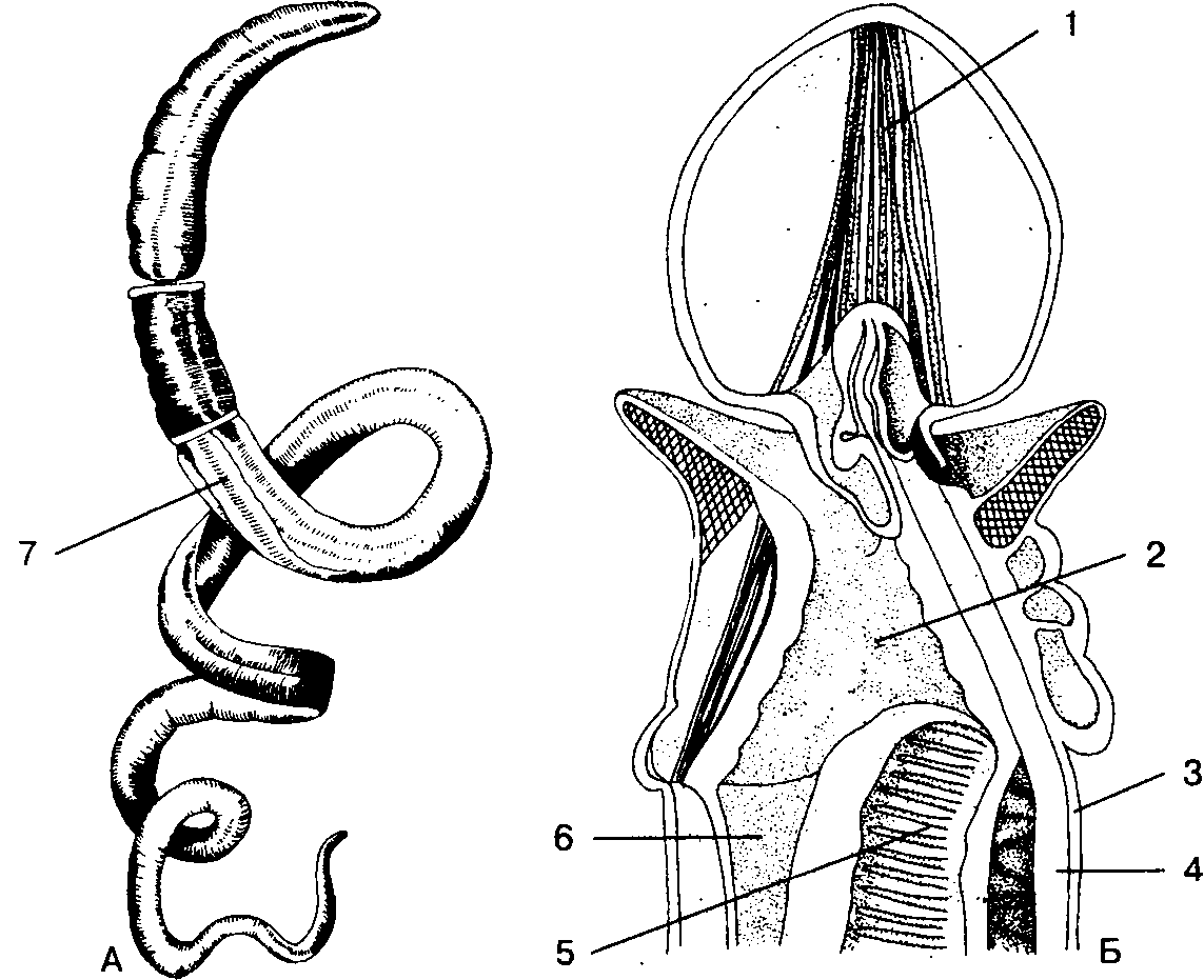Полухордовые класса кишечнодышащих: А – общий вид; Б – строение головного конца; 1 – мышцы хоботка; 2 – глотка; 3 – спинной нервный тяж; 4 – кровеносный сосуд; 5 – кишечник с жаберными щелями; 6 – пищевод; 7 – жаберные щели