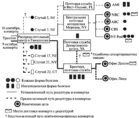 Все четыре обнаруженных конверта, содержащих рецептуру спор В. artthracis были стандартными конвертами почтовой службы США. Все отправлены из Трентона (Нью-Джерси). Первые два направлены в СМИ: одно — в NBC, ведущему Тому Брокау; другое — в New York Post. Обе организации находятся е Нью-Йорк Сити (New York City). На конвертах этих писем стоял штамп с датой отправления — «September 18, 2001». Следующие два письма были адресованы сенаторам Томасу Дашли и Томасу Лихи в Вашингтон (Washington. D.C.), на конвертах штамп — «October 9,2001» Каждое письмо содержало текст: «09-11-01… You can not stop us. We have this anthrax. You die now. Are you afraid?». Но конверты, контаминированные снаружи спорами В. artthracis, найдены на других почтовых участках в Нью-Йорк Сити, во Флориде и в Коннектикуте Сентябрьские письма были транспортированы через различнее почтовое оборудование и доставлялись по узкому маршруту в Нью-Джерси и медийными компаниями в Нью-Йорке. Они были обработаны почтовой службой Трентона (U. S. Postal Service Trenton Mail Processing), затем в распределительном центре в Гамильтоне (Distribution Center in Hamilton, New Jersey). После чего отосланы в Центральную почтовую аппаратную Моргана в Нью-Йорке (Morgan Central Postal Facility), где были рассортированы и доставлены адресатам. Оба этих пункта обработки почты и, по крайней мере, еды пять других в Нью-Джерси, аффилированные с Гамильтоном, были контаминированы спорами сибиреязвенного микроба. Хотя установленные письма с рецептурой сибирской язвы посланы только в ABC и CBS, В. artthracis обнаружена в здании AMI. где работал Р. Стивенс, и, по крайней мере, в шести почтовых отделениях по пути доставки писем в AMI. Эти данные предполагают возможность существования пятого письма с рецептурой, отправленного в средине сентября 2001 г. в AMI, но оно не было обнаружено (Jemigan D. В. et al., 2002).