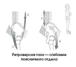 При ретроверсии таза поясничный лордоз уменьшается (сгибание в поясничном отделе). Это называется выпрямление поясничного лордоза. Ретроверсия может происходить с сокращением больших ягодичных мышц (1), с сокращением брюшных мышц (2) или обеих групп мышц одновременно. Ограничение движения определяется натяжением задних связок поясничного отдела позвоночника (3) и мышц-сгибателей бедра (4).