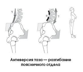 При антеверсии таза поясничный лордоз увеличивается (разгибание в поясничном отделе).