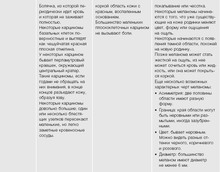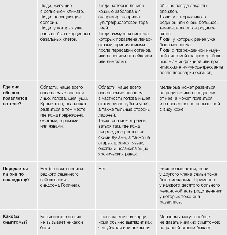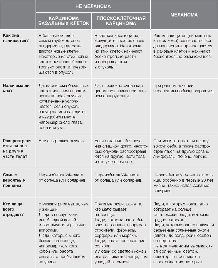 Существует три основных типа рака кожи: карцинома базальных клеток, плоскоклеточная карцинома (типы рака, не являющиеся меланомой) и меланома. В таблице ниже описано все, что необходимо знать об этих трех типах рака кожи (вся информация соответствует данным British Skin Foundation).