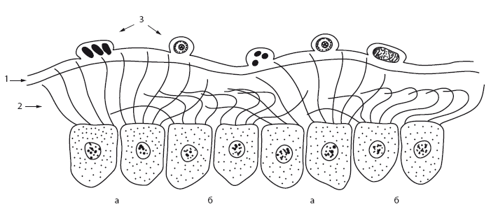 Рис. 7. Движение реснички в эффективной фазе (а) и в возвратной фазе (б): 1 — слизь; 2 — перицилиарная жидкость; 3 — инородные частицы