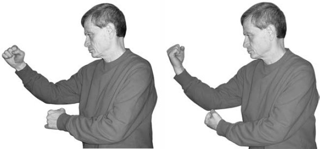 Как правило, в У-Шу, боксе и т. д. руки располагаются (разумеется, с большим количеством вариаций) примерно так, как показано на рисунке ниже слева.