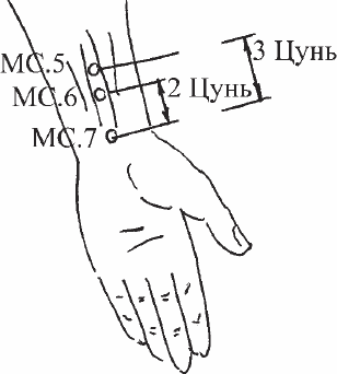 Делается это для того, чтобы уменьшить вероятность воздействия на эту точку. Справедливости ради отметим, что в Нят-Нам (который, как указывалось выше, «учитывает множество вещей») обычно атакуют не одну точку Нэй-Гуань, а сразу три: МС.5 (Цзянь-Ши, или «Промежуточный курьер»), МС.6 (Нэй-Гуань, или «Внутренняя граница»), МС.7 (Да-Лин, или «Большой курган»).
