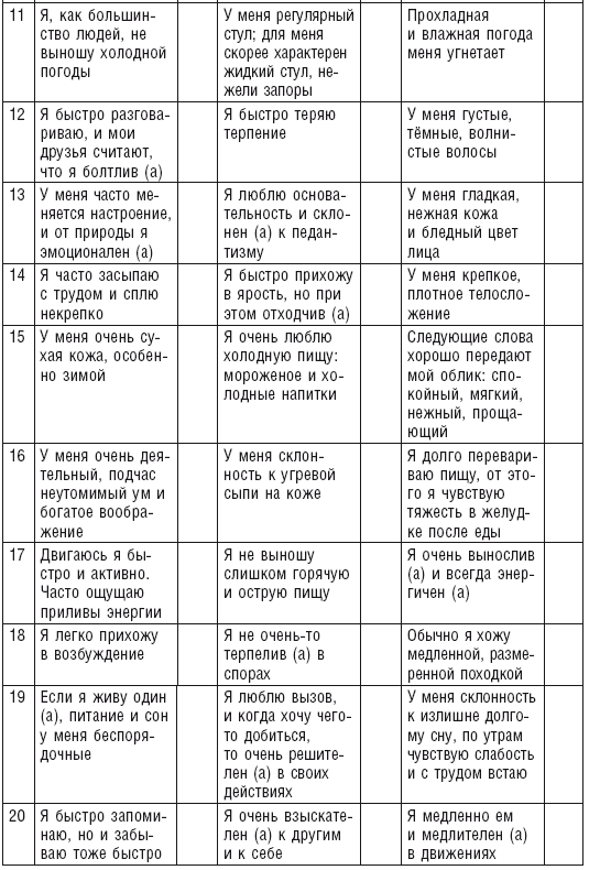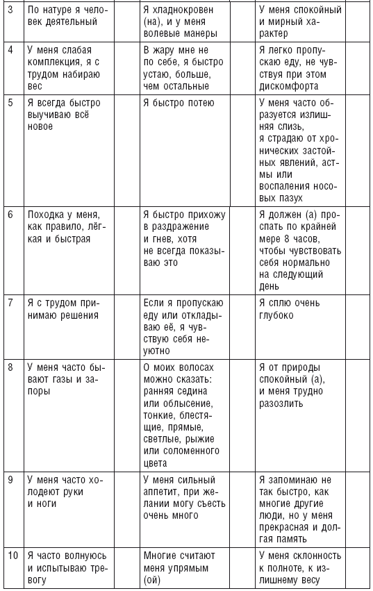 Заполни каждый раздел и подсчитай общую сумму, чтобы заполнить количество баллов для каждой доши. Тщательно обдумывай каждый ответ. Если есть сомнения в том, что отвечать во временных промежутках, поставь цифру, которую можно было бы применить к твоей жизни по крайней мере за последние несколько лет.