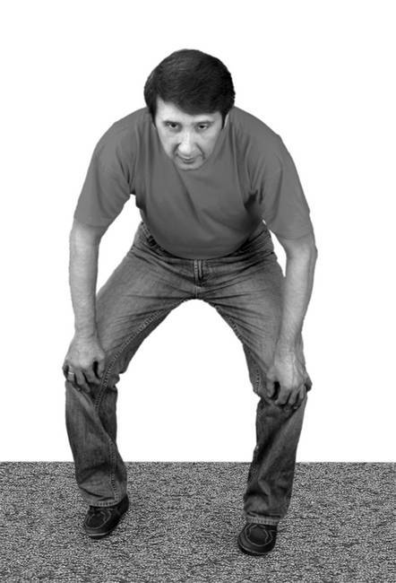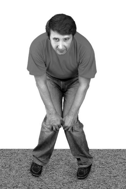 Исходное положение: встаньте; прямые ноги расставлены чуть уже ширины плеч (основная стойка). Спину согните, голову опустите, шею и плечи расслабьте.