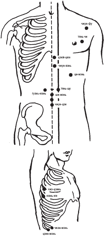 1. Воздействуют на симметрично расположенные точки – при желудочных заболеваниях сочетают точки цзу-сань-ли на обеих конечностях, при гинекологических заболеваниях – на точки сань-инь-цзяо на обеих конечностях, на симметричные точки головы тоу-вэй при лобной головной боли, на точки тянь-шу – при поносе.