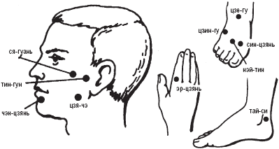 Рис. 22. Точки воздействия при зубной боли различной локализации