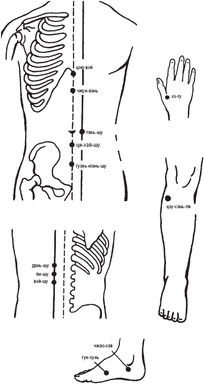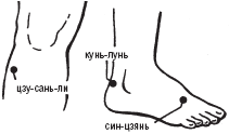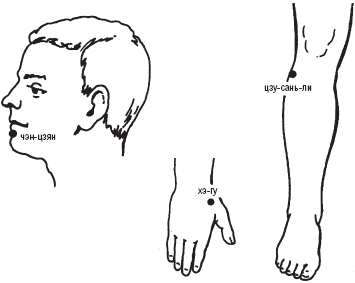 2. Одновременно сочетают воздействие на точки верхних и нижних конечностей при «наслаивающихся» заболеваниях, таких, как нарушение функции желудка и кишечника (точки хэ-гу + цзу-сань-ли).