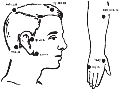 Рис. 27. Точки воздействия при различной локализации головной боли
