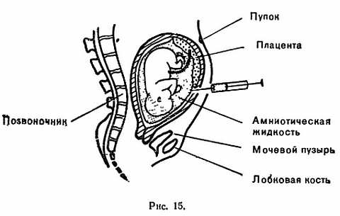 Процедура получения амниотической жидкости из матки тонкой иглой называется амниоцентезом (рис. 15). Обычно амниоцентез проводится акушером, который сначала применяет местное обезболивание, вводя анестезирующее средство в кожу где-то между линией волос на лобке и пупком, и только после этого прокалывает иглой матку. Амниоцентез проводится в кабинете врача или в амбулаторном отделении больницы. Рекомендуемый для проведения процедуры срок—14–16 недель беременности. Это наиболее подходящий срок, потому что увеличенная матка беременной женщины начинает выступать из таза в брюшную полость на 12-й неделе беременности. До этого времени. прощупать матку через брюшную полость невозможно. В 14–16 недель матка легко прощупывается между лобком и пупком. — Вот почему на этом сроке беременности ввести иглу в матку сравнительно легко»