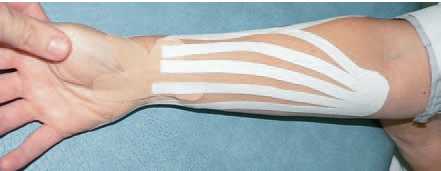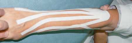 Первоначально был проведено тейпирование, которое считается классикой в лечении туннельного синдрома (рис. 101, а, б).