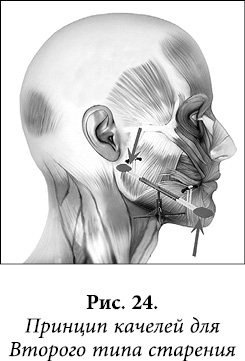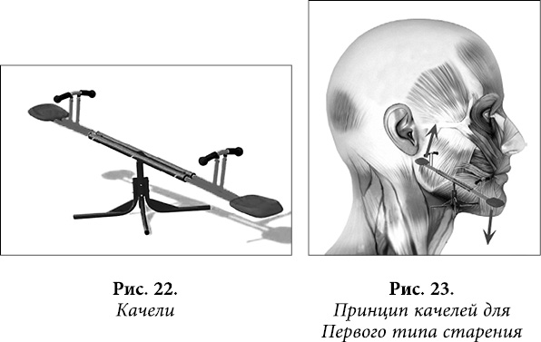 Как только баланс качелей с возрастом начинает смещаться, пропорции лица изменяются. У Первого типа поджатие вверх одного конца качелей в области уха приведет к опусканию вниз их второго конца в районе подбородка.