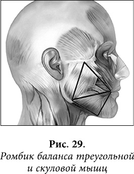 И тогда нарушится второй баланс – между скуловой мышцей и треугольной: если скуловые мышцы растягиваются, треугольные тут же стягиваются. Этот баланс можно показать в виде ромбиков: скуловая и треугольная мышцы образуют один треугольник этого ромбика, а вторая вершина ромбика упирается в челюстной угол, поскольку эта геометрия увязывается с тонусом жевательных мышц, притягивающих нижнюю челюсть к верхней.
