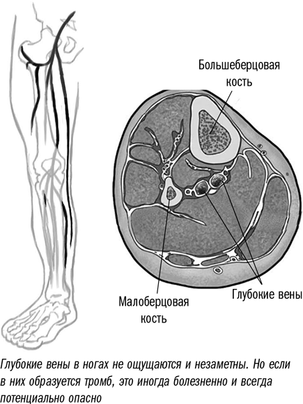 Опасность представляет тромб, который образовался в глубокой вене. Это называется «тромбоз глубоких вен». Большую часть времени такие тромбы находятся слишком глубоко и не ощущаются. Однако иногда голень отекает и делается болезненной. Когда человек сгибает стопу, вытягивая пальцы ног на себя, ему больно.
