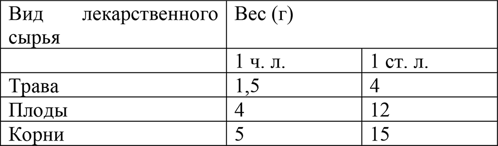 Следует подчеркнуть важность соблюдения дозировок растительных препаратов, особенно при лечении детей. Можно избежать ошибок, если запомнить следующее правило: на каждый год жизни ребенка требуется 1/20 дозы взрослого. Для определения веса лекарственных растений желательно иметь аптечные весы. Если их нет, то для определения приблизительных доз можно пользоваться следующей таблицей: