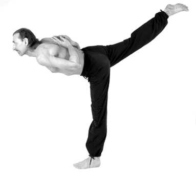 2. Наклоните туловище вперед, одновременно отрывая прямую правую ногу от пола. Сложите руки перед собой в позу приветствия – Намастэ.