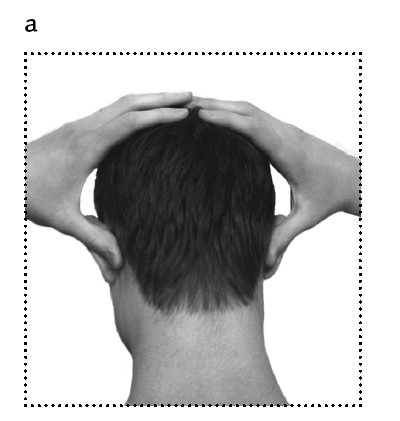 1. Сзади мягко обхватите голову ладонями (четырьмя пальцами, и касайтесь головы только подушечками пальцев). Большими пальцами рук массируйте зону за ушной раковиной, в основном в верхней трети зоны (фото 14, а). Массажные движения вперед-назад повторяйте около 50 раз.