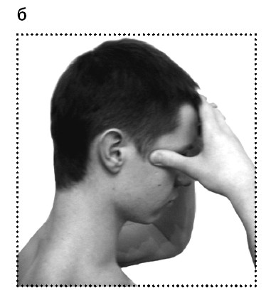 2. Большие пальцы пусть пока останутся на месте. А ладони (подушечки четырех пальцев) переместите на лоб. Теперь большие пальцы переместите на впадинки висков – от угла бровей к уху на 1–2 пальца (фото 14, б). И надавите в течение нескольких секунд.
