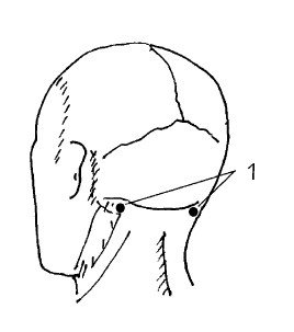 3. Большими пальцами зажмите симметричные (по отношению к позвоночнику) точки на шее (1), расположенные в углублении под черепом (рис. 47). Надавливайте на них 4–5 раз по 10 секунд.