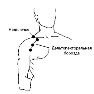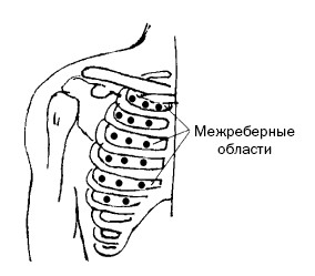 В наибольших межреберных промежутках выделяют по 3 точки. На левой и правой половине груди, таким образом, расположены по 6 горизонтальных рядов активных точек (рис. 43, б).