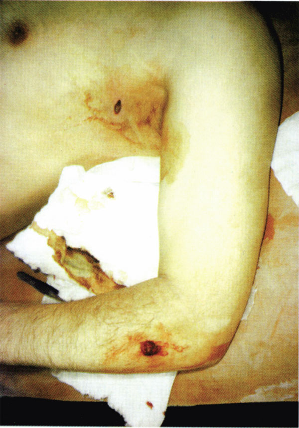 Рис. 3. Сквозное пулевое ранение предплечья и грудной клетки