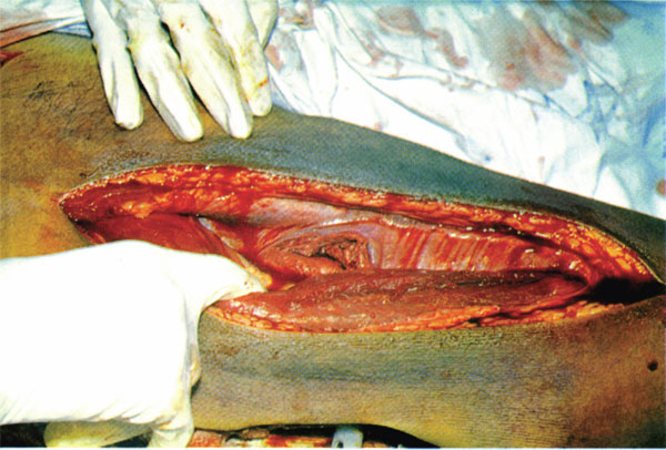 Рис. 9. Свободный газ в мышцах при газовой гангрене