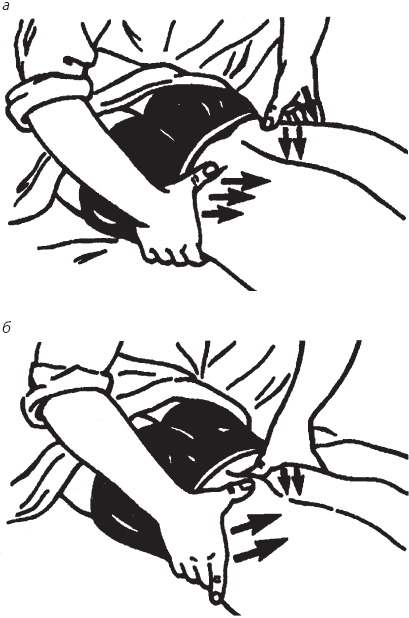 Рис. 61. Воздействие на область таза: а – начало приема; б – завершение приема