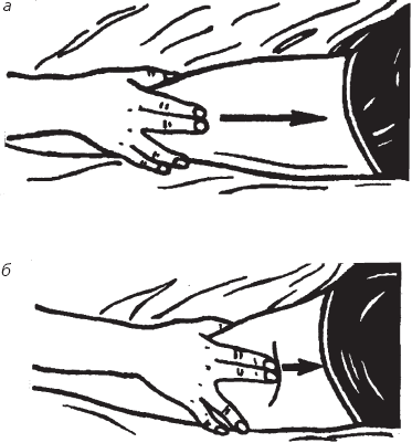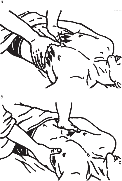 Рис. 62. Воздействие на область грудной клетки по краю реберных дуг: а – начало движения; б – конец движения