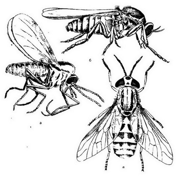 а - мошки; б - мокрецы; в - слепни.