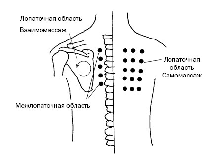 Если можно выполнить взаимомассаж, работаем следующим образом. Надо расположиться сзади массируемого и руки положить на надлопаточную область по обе стороны от шеи. Четыре пальца оказываются на ключицах и играют роль опоры, а для больших пальцев станут доступны верхние точки межлопаточной зоны (по мере работы ладони опускаются ниже). Точки обрабатываются попарно, хотя и разновременно: правый палец давит на правую точку, потом левый – на левую точку того же уровня. Каждая точка обрабатывается 3 секунды. Всего надо сделать не менее 3 проходов по межлопаточной области.