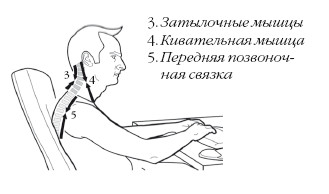 Положения, связанные с акцентуацией шейного изгиба, способствуют укорочению затылочных (3) и кивательных мышц (4). В грудном отделе происходит потеря эластичности передней позвоночной связки (5) и иногда грудных мышц.