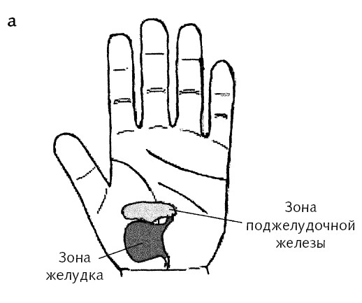 Хороший эффект в этом случае дает воздействие на точку перехода пищевода в желудок. Найдите ее в центре треугольника, образованного линиями кожи у лучезапястной складки (рис. 59, а), и воздействуйте круговым надавливанием по часовой стрелке. Зона подобия при воспалении поджелудочной железы показана на рис. 59, а, б.