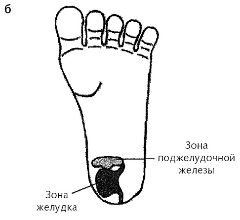Рис. 59, а, б. Зоны воздействия при гастрите и панкреатите