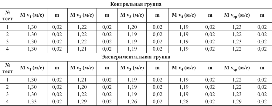 Примечание: Мv1, Mv2, Mv3, Mv4 – среднегрупповые показатели скорости проплывания 1-го, 2-го, 3-го и 4-го 50-метровых отрезков; Mvcp – среднегрупповые показатели средней скорости проплывания теста; m – ошибка среднего.