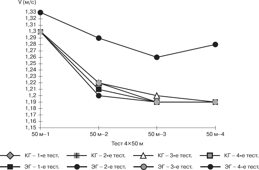 Из представленных в таблице результатов следует, что шесть недельных тренировочных микроциклов пловцов КГ и четыре недельные тренировочные микроцикла пловцов ЭГ не привели к значимым изменениям (р>0,1) среднегрупповых показателей скорости проплывания 50-метровых отрезков и среднегрупповых показателей средней скорости проплывания теста, что свидетельствует о неэффективности предложенных пловцам обеих групп тренировочных программ.