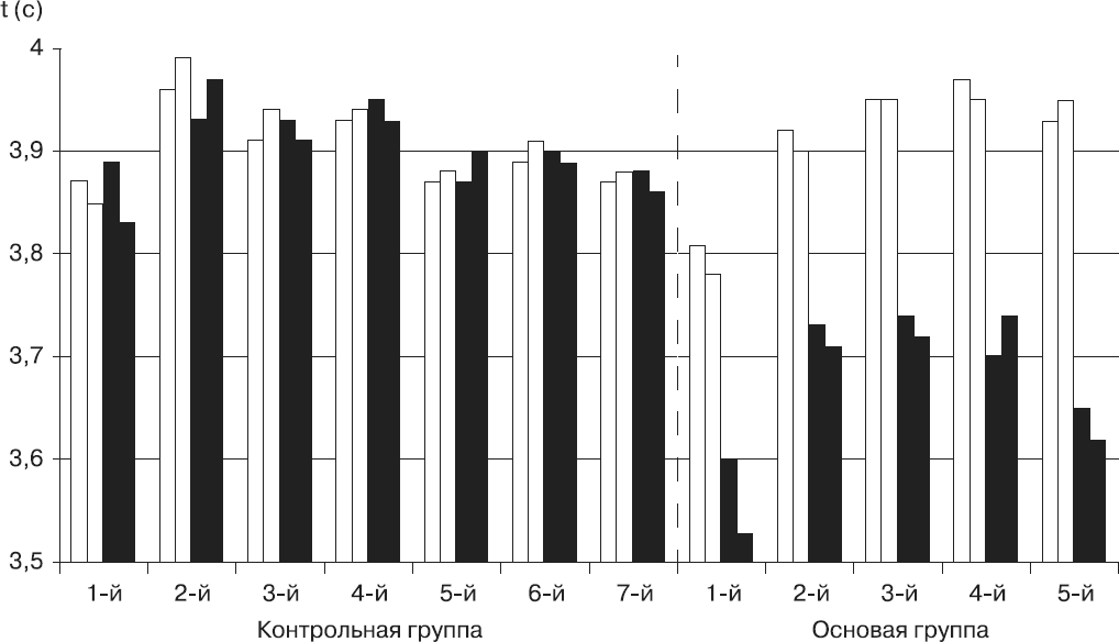 Рис. 12. Индивидуальные результаты исходных (светлый фон) и заключительных (темный фон) тестирований (бег на коньках 26 м со старта) хоккеистов контрольной (7 чел.) и основной (5 чел.) групп – до и после проведения комплексных мероприятий по повышению уровня тренированности
