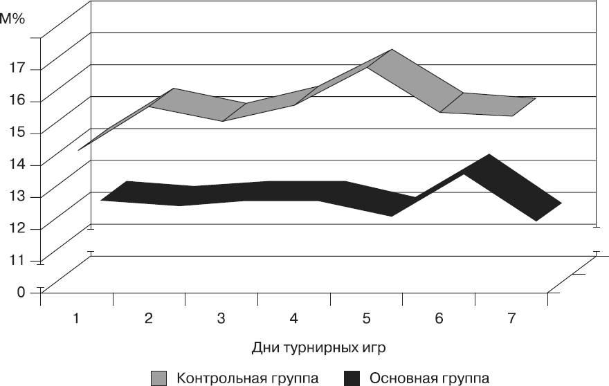 Из представленных на рис. 13 данных видно, что полизональное чрескожное лазерное стимуляционное воздействие оказывало позитивное влияние на состояние миокарда хоккеистов основной группы уже с первого сеанса и обеспечивало игрокам лучшие условия для функционирования сердца на протяжении всего хоккейного турнира. Это позволяет сделать вывод о том, что лазерное стимуляционное воздействие не является, по крайней мере непосредственно для сердца, «кнутом», вызывающим неадекватное повышение напряженности работы сердечной мышцы. Более того, полученные данные можно расценивать как свидетельство экономизации функций сердца в результате лазерного стимуляционного воздействия на организм спортсмена. Можно также предположить, что в основе одного из механизмов, способствующих этой экономизации сердечной функции, лежит улучшение реологических свойств крови в результате чрескожного лазерного воздействия на магистральные сосуды [С. Е. Павлов, А. С. Павлов, А. А. Петров, 2014].