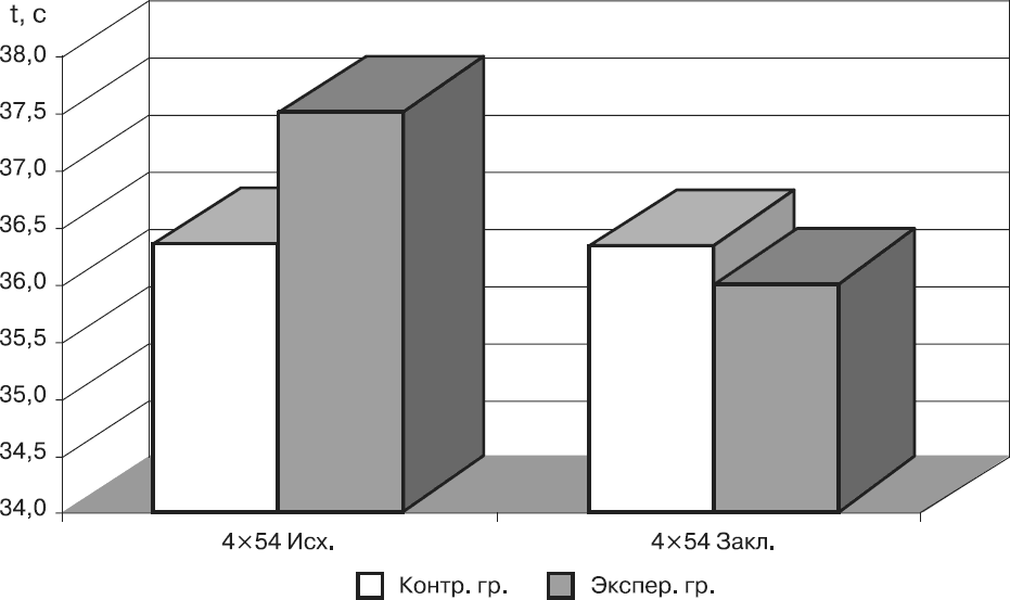 Рис. 15. Среднегрупповые результаты исходного и заключительного тестирования (пробегание на время дистанции 4?54 м на коньках) хоккеистов контрольной и экспериментальной групп