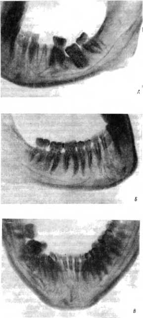 Рис. 115. А — рентгенограмма правой половины нижней челюсти скифского царя; Б — рентгенограмма левой половины нижней челюсти; В — рентгенограмма нижней челюсти скифского царя из кургана Куль-Оба.