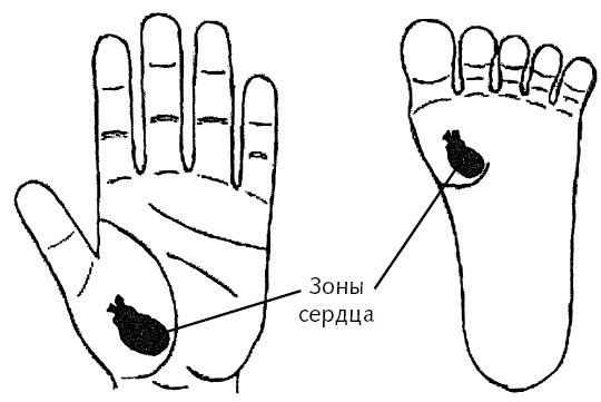 При частой одышке, которая сопровождает многие патологии сердца, воздействуют на зону сердца (рис. 57, а, б) и на зону подобия легких (рис. 55, а, б). Сначала пальцами массирующей руки проверяют зону сердца и стимулируют все болезненные точки в этой зоне. Затем проводят массаж зоны легких, который стимулирует прохождение воздуха. Направление массажа соответствует направлению выдоха, то есть от основания большого пальца к ногтевой фаланге вдоль трахеи.