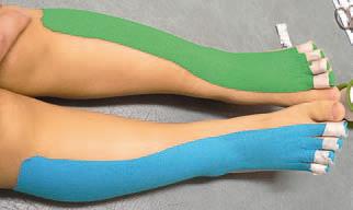 В демонстрируемом варианте просьба обратить внимание только на то, как затейпированы пальцы ног. Тейпирование m. tibialis anterior будет оговорено ниже.