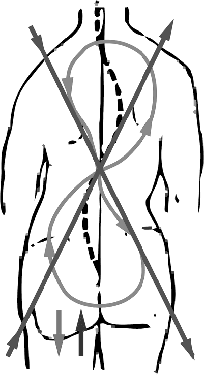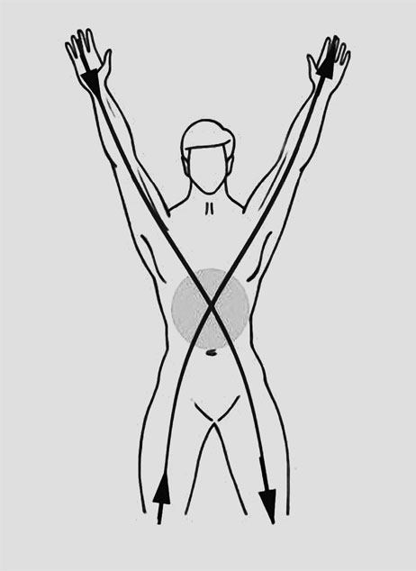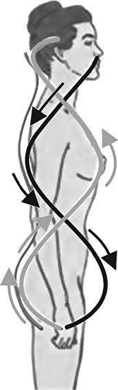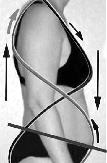 Пересекаясь в солнечном сплетении, линии расходятся в разные стороны, открывая возможность верхней половине тела двигаться относительно нижней.