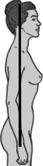 Та же эталонная ось, идущая в саггитальной плоскости, должна идти по профилю тела человека через несколько ключевых точек: центр пятки, шарнир тазобедренного сустава, акромиальный отросток плеча (его головку) и центр наружного слухового прохода.