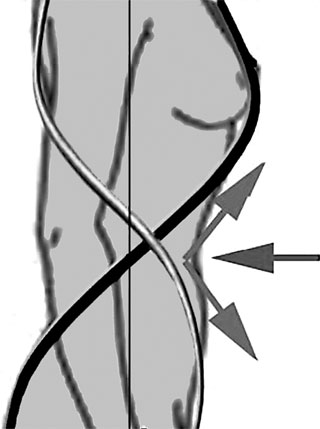 Черная линия излишне плоская, а серая, наоборот, слишком выпуклая, а их пересечение выносится кпереди, вместо того чтобы пересекаться во внутреннем канале тела (соответствующему положению внешней Гравитационной вертикали).