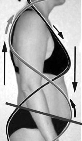 Мы тоже, прежде чем «взлететь» второй ступенью, делаем разбег по земле. Поэтому настолько важен активный образ жизни: ритмичная быстрая ходьба, возвращающая нормальную скорость процессам метаболизма. При ведении сидячего образа жизни, когда мы предпочитаем сидеть, а не активно двигаться, верхняя половина тела начинает «опадать» на нижнюю – позвоночник укорачиваться, грудная клетка оседать, зажимая собой органы, участвующие в обеспечении главных жизненных процессов. А экономно расходовать энергию при движении нам помогает спираль нашего тела. Ее направления – это физиологические направления движения фасций при корректно идущем краниосакральном ритме. «Зона левитации» в ЖКТ при этом открывается. Это обеспечивает не только симметрию нашему телу, но и прохождение «холодного термояда» в кишечнике и режим работы обмена веществ. И все потому, что следуя краниосакральному ритму тело то удлиняется, сужаясь, то укорачивается, расширяясь в талии. И в этом расширении своем выгибается дугой, открывая систему левитации ЖКТ.