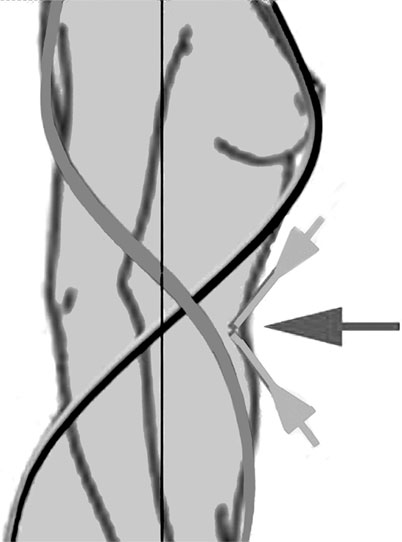 Выявить подобную асимметрию можно не только по уровню ягодиц, но главное и по уровню талии и бедер – в данном примере правый бок будет выше левого. В своей норме такие деформации свойственны «условно здоровому» человеку и практически не проявляются в теле. Как только система левитации закрывается, эти деформации начинают увеличиваться и приводить к сколиозам, ротациям и наклонам тела. Поэтому общая статика всегда определяется компенсационными реакциями тела на свое «заваливание» на опорную ногу в попытках удержать равновесие.